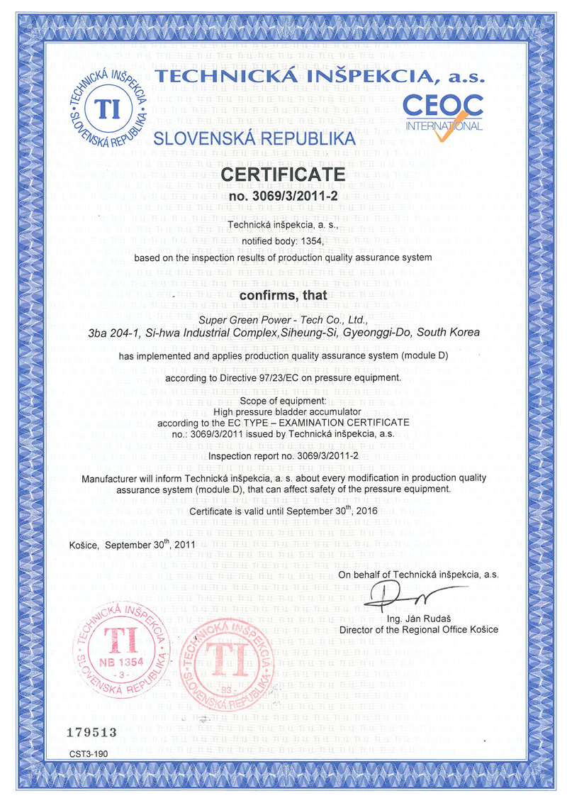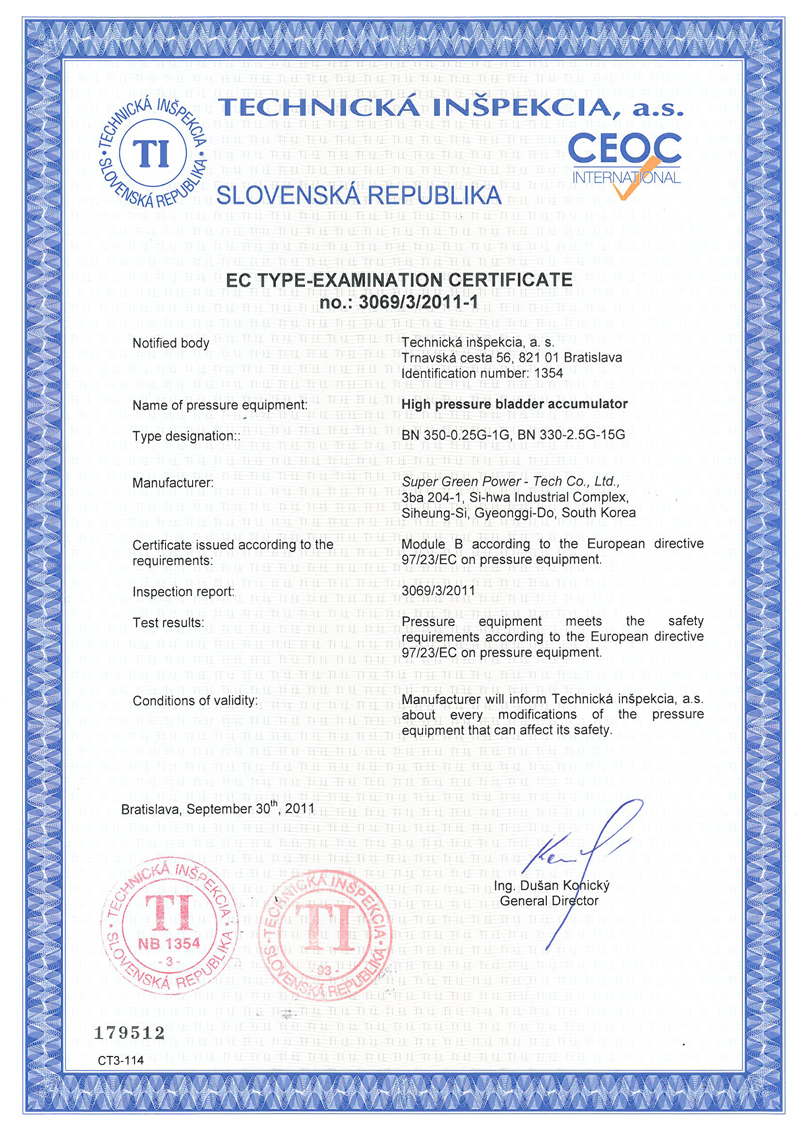 Bladder Type AccumulatorÀÇ CEÀÎÁõ¼ÀÔ´Ï´Ù.